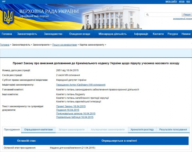 | У Верховній Раді України народним депутатом Антоном Геращенко зареєстровано проект Закону про внесення доповнення до Кримінального кодексу України щодо підкупу учасника масового заходу (№ 2651).
