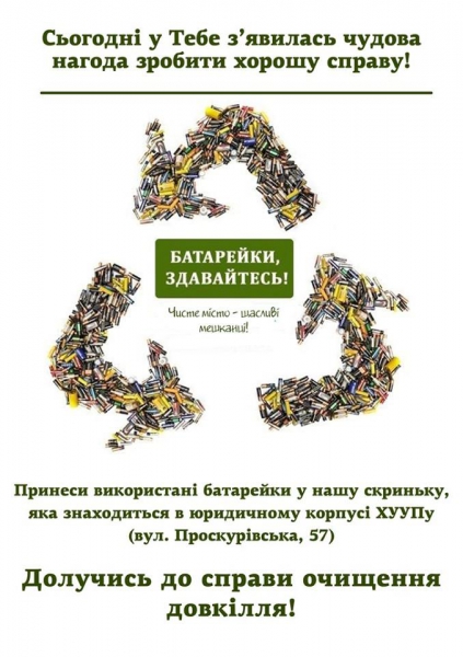 | Екоактивісти четвертого курсу юридичного факультету Хмельницького університету управління та права оголошують про початок акції "Батарейки, здавайтесь!", метою якого є донести до свідомості людей необхідні ...... Подробней |