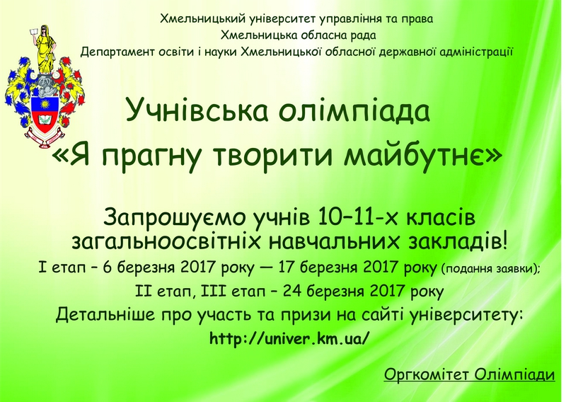До уваги учнів 10-11-х класів загальноосвітніх навчальних закладів. Оголошується олімпіада. Деталі та умови участі - за посиланням.  Подробней