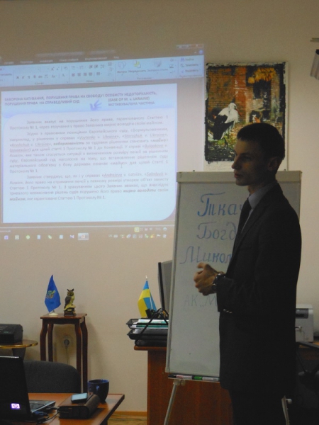 Так, 21 листопада в приміщенні юридичної клініки відбулася зустріч з юристом АК «Місяць і партнери» Ткачуком Богданом Миколайовичем, який виступив на тему: «Практика звернень до Європейського суду з прав людини». Студентам була представлена презентація, що стосувалась вказаної проблематики та наочно відображала основні положення виступу доповідача. Зокрема, Богдан Миколайович розкрив інформацію про порядок звернення до Європейського суду з прав людини; вимоги, які ставляться до змісту заяви, її обґрунтування, темпоральних меж подання, тощо. В ході доповіді було вказано, що Україна на сьогодні займає четверте місце за кількістю справ, які знаходяться на розгляді в Європейському суді з прав людини. Також увагу було звернуто на ті категорії справ, з якими українці найчастіше звертаються до вказаного міжнародного органу та практику виконання його рішень в нашій державі.