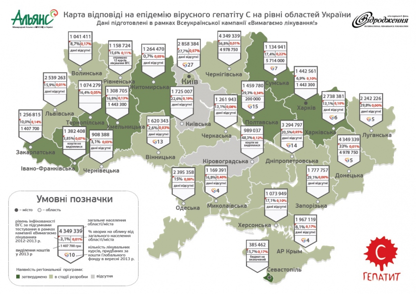 Спільні зусилля Альянсу-Україна, представників державних структур та активістів з питань розширення доступу до лікування ВГС у рамках всеукраїнської кампанії "Вимагаємо лікування!" вже сприяли затвердженню Державної й обласних програм з протидії поширенню гепатиту С, частковому виділенню коштів з державного бюджету та бюджетів Полтавської, Сумської, Житомирської, Хмельницької, Закарпатської, Тернопільської, Вінницької областей, а також з бюджетів міст Харків і Севастополь. Але реальна потреба у лікуванні значно вища – на сьогоднішній день лише у цих регіонах у черзі на лікування перебуває близько 16 тис. осіб, тому збільшення виділення бюджетного фінансування усіх рівнів є життєво необхідним.