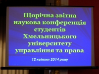 12 квітня 2014 року у Хмельницькому університеті управління та права відбулася традиційна щорічна звітна наукова конференція студентів університету. Цього року до участі у конференції було заявлено 360 наукових робіт. ![]() |