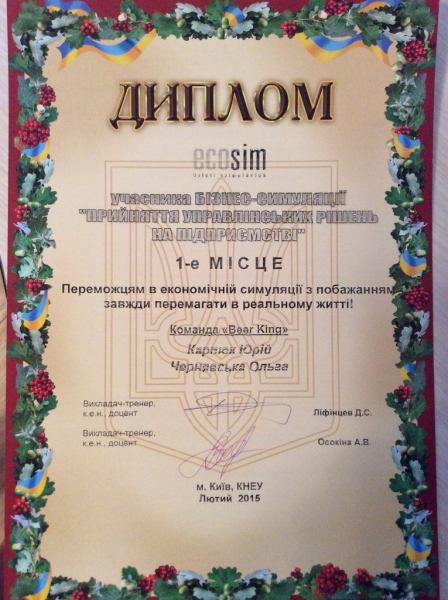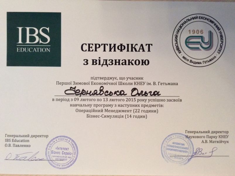 Варто відзначити, що серед учасників Першої Зимової Економічної Школи була і наша студентка 4 курсу факультету управління та економіки Чернявська Ольга, яка не тільки одержала сертифікат з відзнакою від КНЕУ та IBS education, але й зайняла перше місце при прийнятті управлінських рішень у бізнес-симуляції віртуального ринкового середовища.