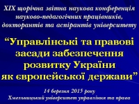 14 березня 2015 року в головному корпусі університету успішно пройшла вже XIX щорічна звітна наукова конференція науково-педагогічних працівників, докторантів та аспірантів Хмельницького університету управління та права, яка цього року проходила під загальною темою "Управлінські та правові засади забезпечення розвитку України як європейської держави".