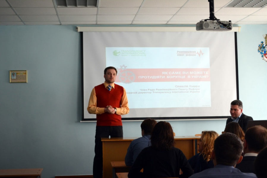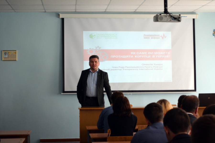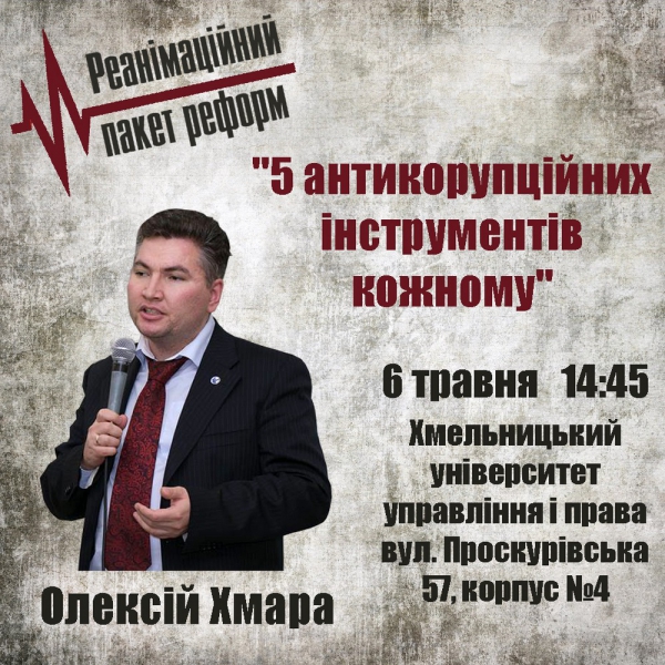 6 травня 2015 року в Хмельницькому університеті управління та права відбулося експертне обговорення на тему: "5 антикорупційних інструментів кожному" за участі виконавчого директора Transparency International Україна, експерта групи Реанімаційного Пакету реформ (РПР) "Антикорупційна реформа" Олексія Хмари. Участь в заході взяли близько 150 студентів університету, викладачі та громадські активісти.