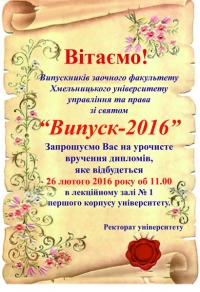 Запрошуємо Вас на урочисте вручення дипломів, яке відбудеться 26 лютого 2016 року об 11-00
