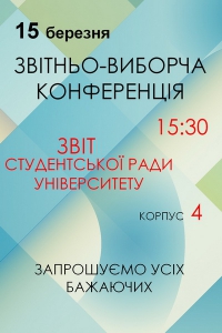 Дорогі студенти Хмельницького університету управління та права, 15 березня у корпусі № 4 по вулиці Проскурівська 57, о 15.30 відбудеться Звітньо-виборча конференція. Усі бажаючі можуть взяти участь у цьому заході.