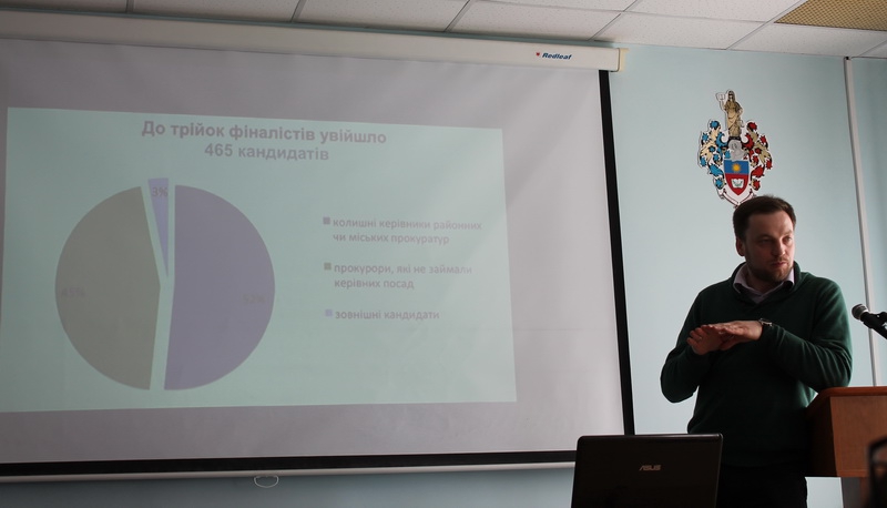 Детально були висвітлені питання проведення відкритого конкурсу з обрання кандидатів на адміністративні посади в місцеві прокуратури: етапи на основі яких і відбувалась сама реформа, цікаві факти та спостереження. Ми дійсно почули те, що можна дізнатись від людини, яка безпосередньо була задіяна до такої роботи. Підсумки реформи прокуратури: відсоткове співвідношення кількості кандидатів різних категорій, які подали заявки на проходження конкурсного відбору, пройшли та безпосередньо були рекомендовані на відповідні посади; переваги та недоліки реформи та власну думку з цього приводу.