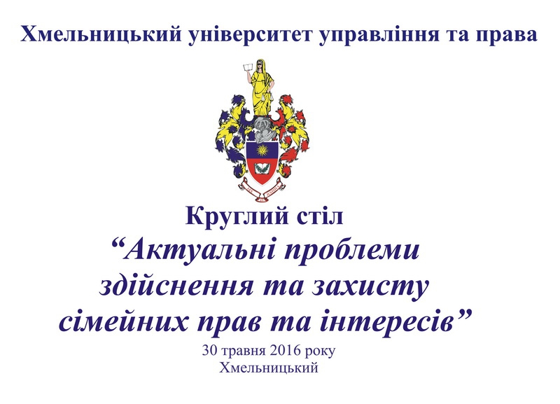 Запрошуємо Вас взяти участь у Круглому столі «Актуальні проблеми здійснення та захисту сімейних прав та інтересів», що відбудеться 30 травня 2016 року о 13-00 у Хмельницькому університеті управління та права (перший корпус, вул. Героїв Майдану, 8).