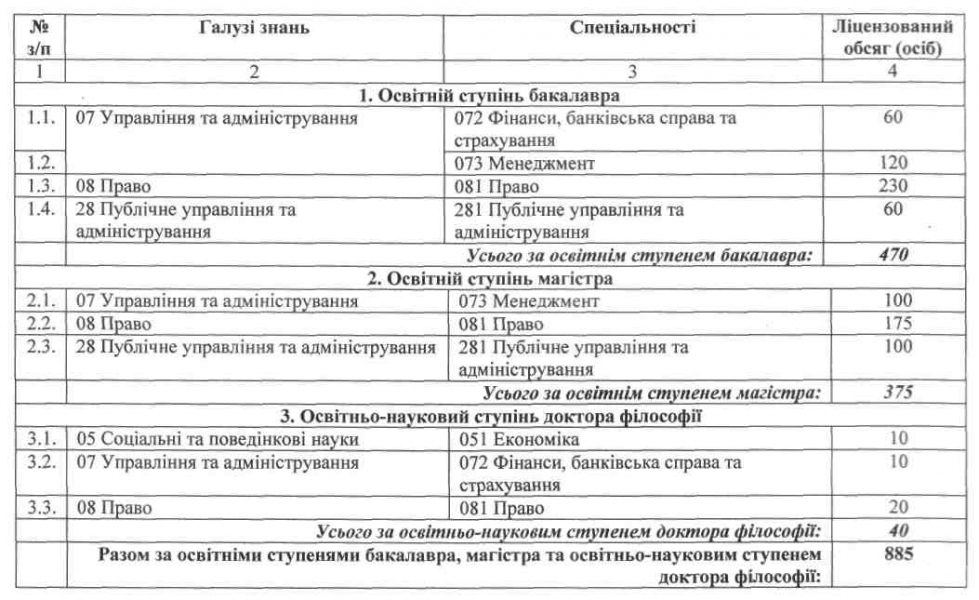 - від 09.02.2017, протокол № 39/1, затвердженим наказом Міністерства освіти і науки України від 10.02.2017 № 28-л, ліцензовано підготовку в університеті на другому (освітньому) рівні здобувачів вищої освіти освітнього ступеня магістра за трьома спеціальностями – 073 Менеджмент ліцензованим обсягом 100 осіб, 081 Право ліцензованим обсягом 175 осіб, 281 Публічне управління та адміністрування ліцензованим обсягом 100 осіб;