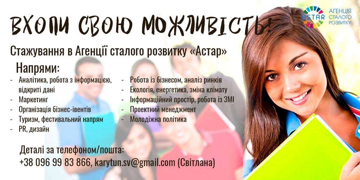 « Агенція сталого розвитку «Астар» запрошує пройти стажування за наступними напрямами: