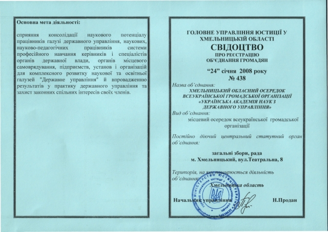 Юридична адреса постійно діючого центрального статутного органу об’єднання громадян: Рада Хмельницького обласного осередку Всеукраїнської громадської організації "Українська академія наук з державного управління"; м. Хмельницький, вул. Театральна, 8.