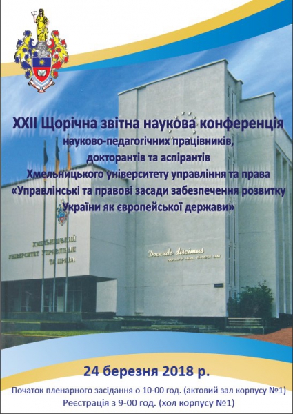 Шановні колеги! Запрошуємо Вас взяти участь у XXІІ щорічній звітній науковій конференції науково-педагогічних працівників, докторантів та аспірантів університету «Управлінські та правові засади забезпечення розвитку України як європейської держави», яка відбудеться 24 березня 2018 року.
