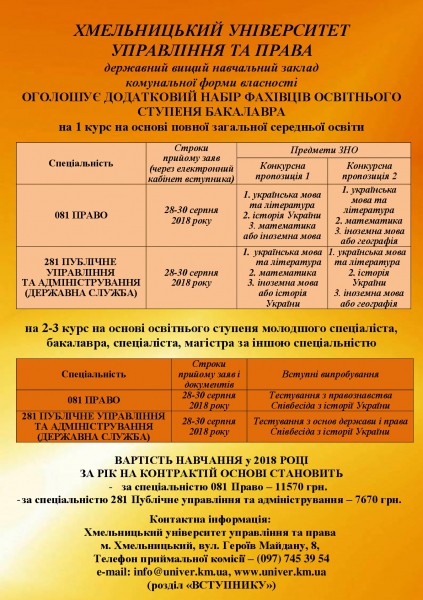 ХМЕЛЬНИЦЬКИЙ УНІВЕРСИТЕТ УПРАВЛІННЯ ТА ПРАВА ОГОЛОШУЄ ДОДАТКОВИЙ НАБІР ФАХІВЦІВ У 2018 році