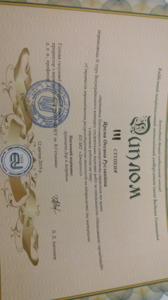 Ярема Оксана Русланівна виборола диплом ІІІ ступеня за перемогу у другому турі Всеукраїнського конкурсу студентських наукових робіт з природничих, технічних і гуманітарних наук за напрямом «Менеджмент організацій» (12 квітня 2019 року, м. Київ) з науковою роботою на тему «Стратегія впровадження ресурсозберігаючих технологій на підприємстві (на матеріалах КП ВКГ «Джерело»)».