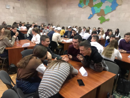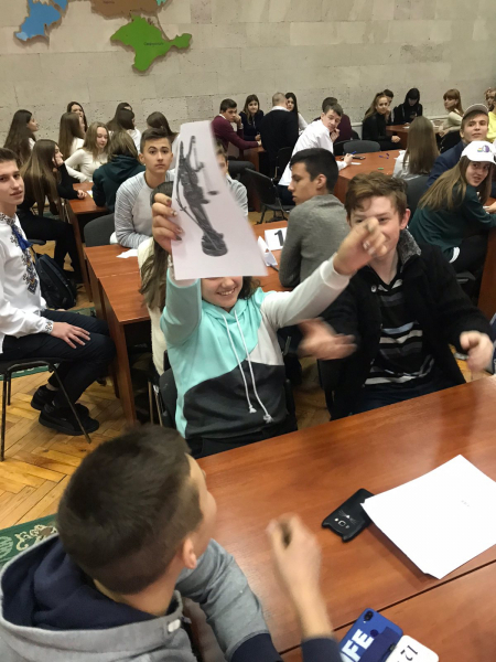 Під час шостої гри «Крокодил» один із учасників команди за допомогою жестів, рухів та міміки мав показати іншим учасникам слова з правової тематики.
