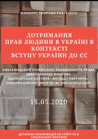 З метою реалізації Всесвітньої програми освіти в сфері з прав людини (прийнятої ООН у 2004 р.), Хартії Ради Європи «Освіта для демократичного громадянства та освіта з прав людини» та Національної стратегії з прав людини (Указ Президента України №501/2015) Хмельницький університет управління та права імені Леоніда Юзькова за підтримки Представництва ЄС в Україні, Адвокатської контори «Місяць і партнери» оголошує конкурс творчих робіт (есе) для студентів юридичних факультетів закладів вищої освіти та учнів 9-11 класів загальноосвітніх закладів.