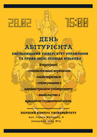 Запрошуємо школярів з друзями та батьками відвідати День Абітурієнта, який відбудеться у форматі Open Day, в Хмельницькому університеті управління та права іменні Леоніда Юзькова 28 лютого 2020 о 15:00!