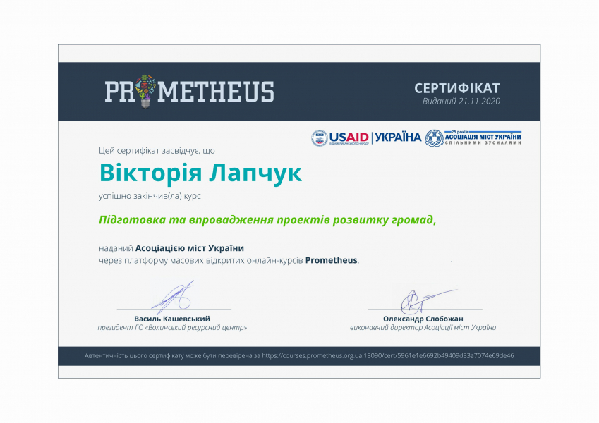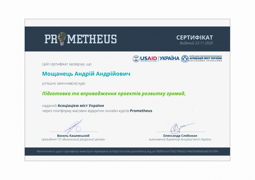 PS. Курс «Підготовка та впровадження проектів розвитку громад» підготовлено в рамках проекту USAID «Розробка курсу на зміцнення місцевого самоврядування в Україні» (ПУЛЬС), який впроваджує Асоціація міст України. Децентралізація та реформування державного управління регіональним розвитком в Україні посилили необхідність володіння навичками проектного менеджменту. Враховуючи глобальну тенденцію до застосування управлінських підходів, орієнтованих на результат, щороку зростає потреба в проектних менеджерах.