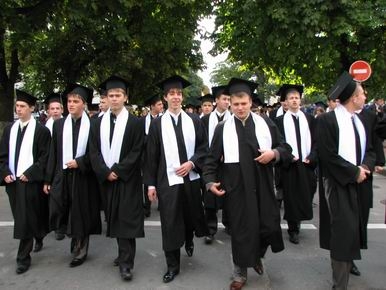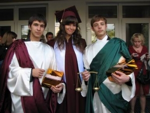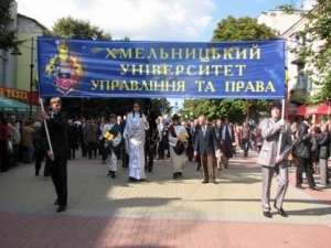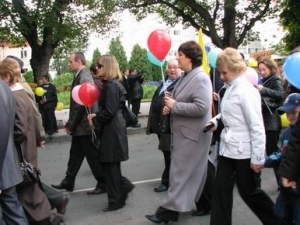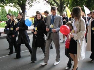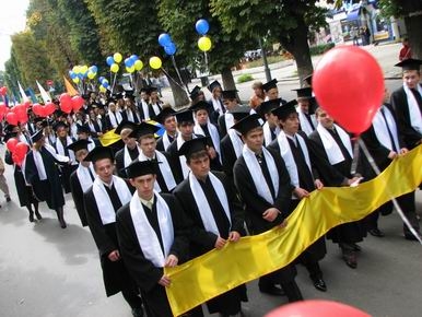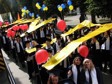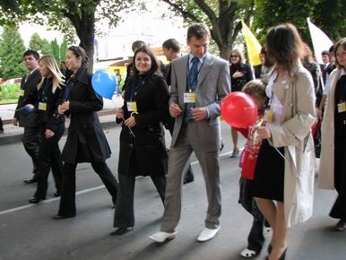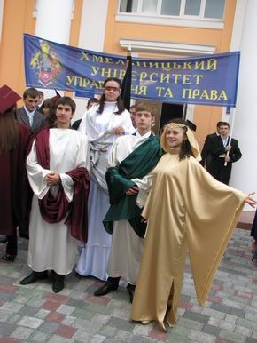 За птахом рівними рядами «летіли» наші найкращі студенти одягнені в класичні мантії. Коли ж колона підійшла до трибуни, де знаходилось керівництво міста і почесні гості, студенти підняли над головами величезні золотисті букви, що склалися в абревіатуру «ХУУП»!