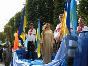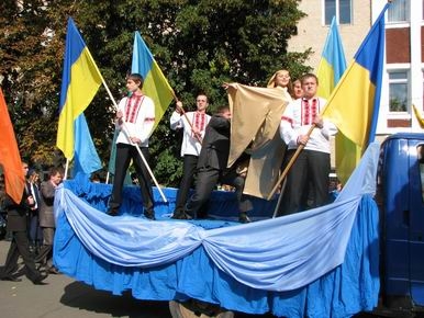 Але головною прикрасою колони був театралізований образ птаха, що здіймався в піднебесся, як символ наших прагнень до знань та мрій про світле майбутнє! А ширяв цей птах над державними стягами, що розвівались на вітрі!