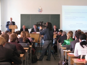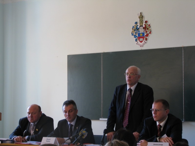 Перед присутніми виступили: Віталій Олуйко – ректор Хмельницького університету управління та права, доктор наук з державного управління, професор, Заслужений юрист України; Олег Соскін - директор Інституту трансформації суспільства, професор, завідувач кафедри міжнародної економіки та підприємництва Національної академії управління, заступник голови Координаційної Ради Громадської Ліги Україна – НАТО, керівник проекту зі створення регіональних центрів євроатлантичної інтеграції в Україні; Олександр Неприцький - доцент кафедри всесвітньої історії Вінницького державного педагогічного університету ім. М.Коцюбинського, кандидат історичних наук; Ростислав Огризко - перший секретар відділу політичних питань євроатлантичної інтеграції Департаменту НАТО Міністерства закордонних справ України.