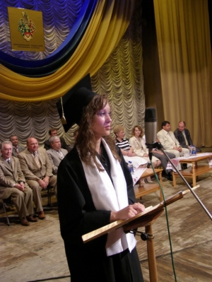 Почесні гості та запрошені вітали наших випускників і бажали щастя, здоров’я та подальших професійних звершень у майбутньому! А від імені випускників слово мала колишня голова Студентської ради, випускниця юридичного факультету Алла Сліворська.