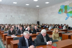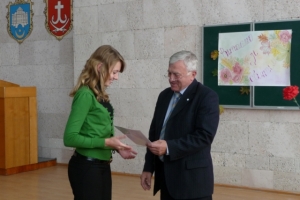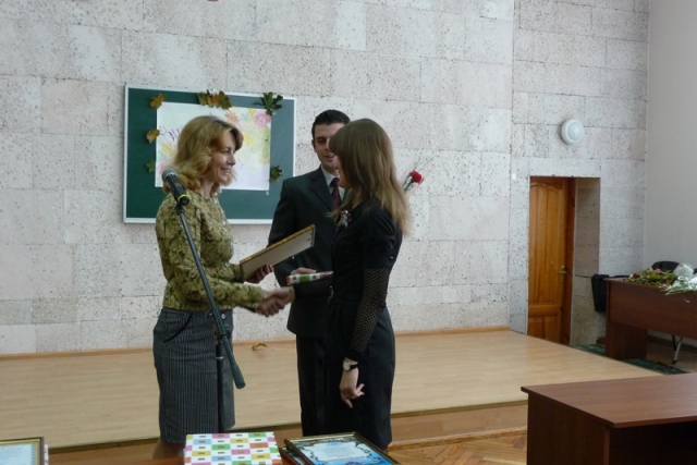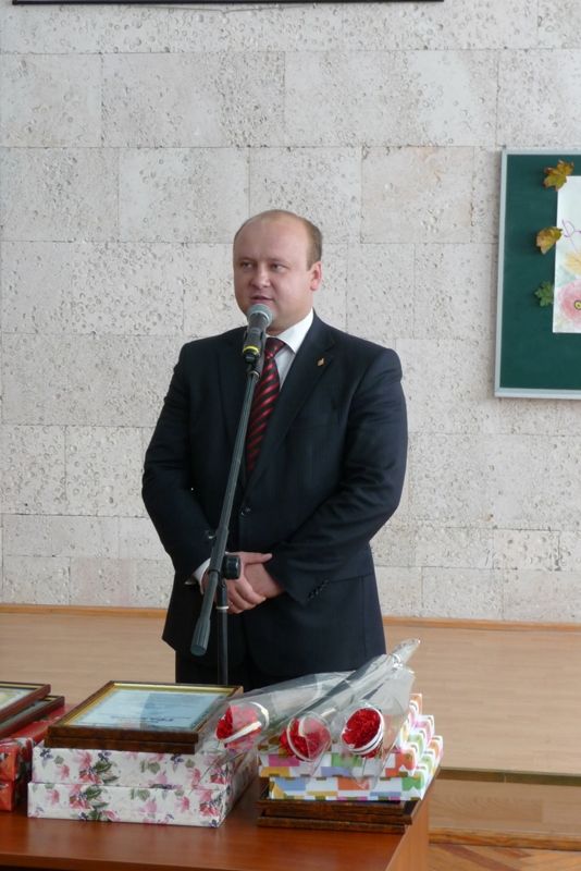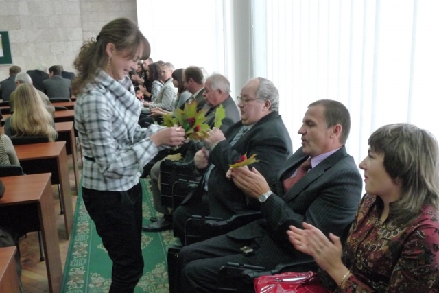 усіх присутніх з професійним святом, а окремим представникам колективу вручив грамоти та подарунки. З особливим трепетом та гордістю колектив вітав оплесками кандидата фізико-математичних наук, доцента В. В. Заїкіну, якій надійшла подяка від Президента України В. Ющенко! На святі була присутня і керуюча справами виконавчого комітету Хмельницької міської ради Л. П. Черевченко. Людмила Петрівна від імені міської ради також привітала колектив університету зі святом і вручила кращим науково-педагогічним працівникам цінні подарунки та почесні грамоти. Від імені Федерації профспілок області вітальне слово тримали Г. П. Харьковський та голова обкому профспілок працівників освіти А. С. Яремюк, які також прийшли в гості з подарунками. Приємним сюрпризом для усіх став виступ випускниці факультету управління та економіки Лесі Шуляк.
