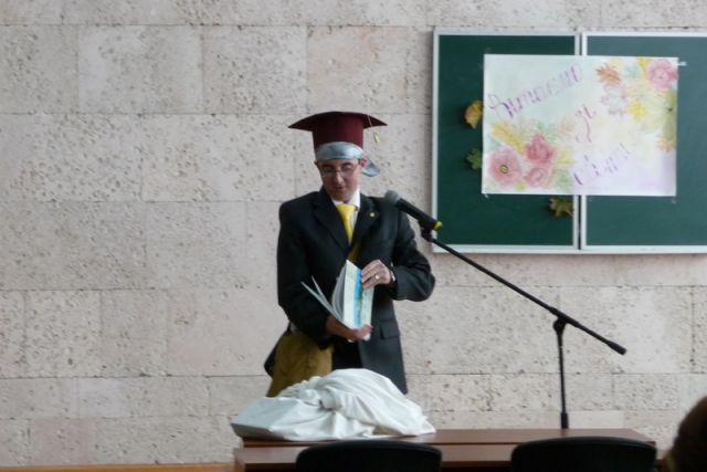 А після офіційних вітань та врочистих побажань розпочався святковий концерт підготовлений Студентською радою університету та активістами художньої самодіяльності. Ми почули чарівний спів у виконанні Л. Степанишиної (4 - ЮФ), К. Джигун (3 - ЮФ), А. Діхтярук (5 -ФУЕ), дуету О. Яцкоборовської та В. Тимощук (2 - ЮФ). А Зоряна Олійник (3 - ЮФ) зі своїм партнером подарували всім присутнім неперевершений бальний танок. Проте кульмінацією свята стала гумористична театральна постановка на тему «Ідеальний студент» у виконанні студента 3 курсу юридичного факультету Комаринського Сергія. Ідеальний студент у його виконанні їздив лише на екологічно чистому транспорті – велосипеді, знав на пам’ять цивільний кодекс та 100 визначень фінансів і весь вільний час проводив у стінах бібліотеки!