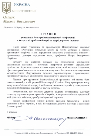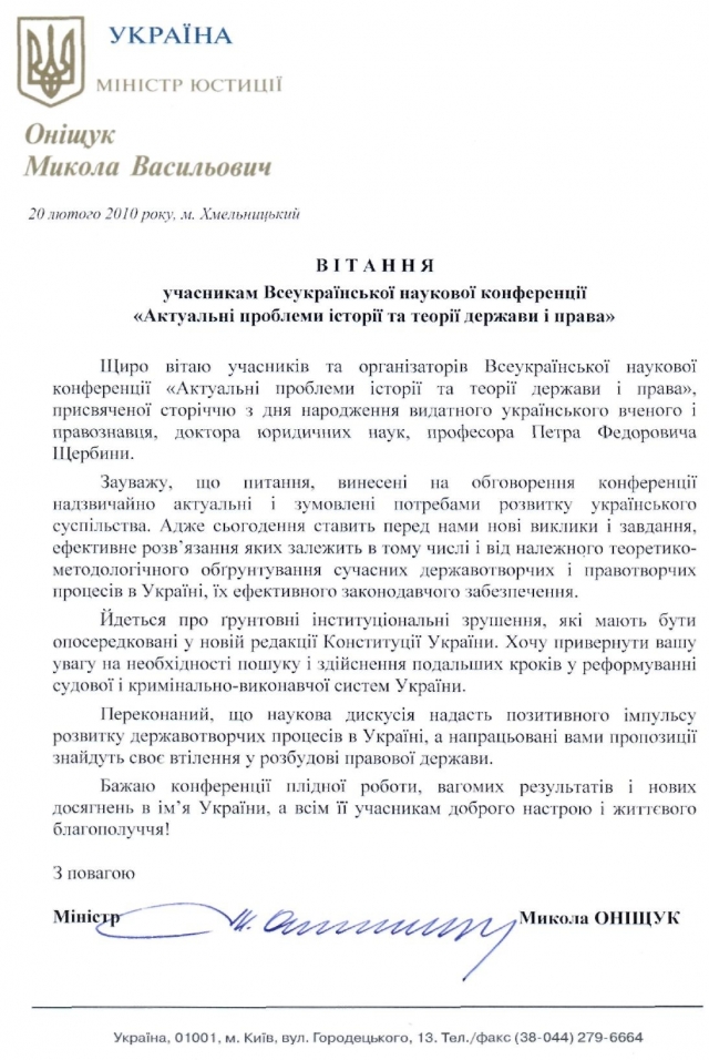 Ми щиро сподіваємося, що цей захід стане ще одним кроком до становлення правової української держави, розвитку вітчизняної науки та збереження наукових традицій школи юриспруденції започаткованої П.Ф. Щербиною на Поділлі.