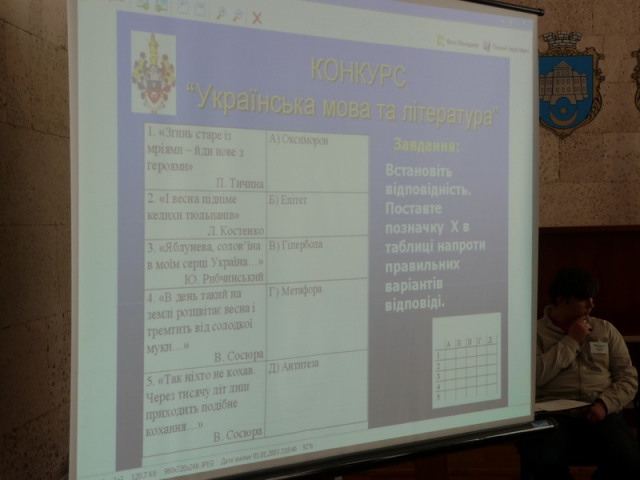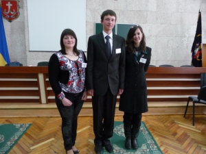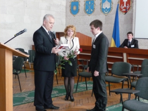 І ось нарешті, після вручення подарунків і сертифікатів про участь в олімпіаді для усіх її учасників, ректор університету Олег Омельчук разом із заступником начальника управління освіти і науки Олександром Попиком запросили на сцену суперфіналістів. Не будемо інтригувати читача – перше місце і 2 тисячі гривень заслужено отримала Улянка Скрипкевич, друге і третє місце – Вітя Васильєв та Алла Лавренюк, відповідно.