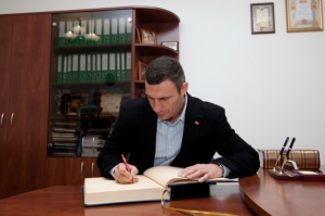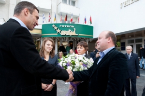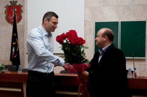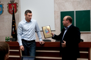 В подарунок від університету ректор О. М. Омельчук вручив для В. В. Кличка гравюру із зображенням герба університету та пам’ятним написом. Звісно, жіноча половина студентського колективу не залишила Героя без осінніх квітів. Навзаєм, Віталій Володимирович поділився своїми враженнями про зустріч на сторінках Книги відгуків почесних гостей Хмельницького університету управління та права.