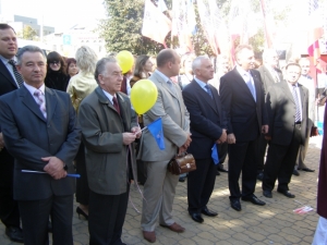 Місту наш університет зробив незвичайний подарунок – власноруч зроблений герб Хмельницького, але незвичайний, а викладений з блакитних і жовтогарячих хризантем. Він, без сумніву, запам’ятався усім присутнім на святі. Ну, і звісно - наш традиційний салют повітряними кульками в небесну синь.