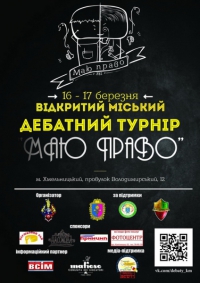 На минулих вихідних Хмельницький університет управління та права приймав гостей з 11 навчальних закладів І-IV рівня акредитації нашого міста та Кам’янця-Подільського. 40 активних молодих людей, переважно представники студентського самоврядування та громадські активісти, взяли участь в унікальному Хмельницького заході – першому Відкритому міському дебатному турнірі «Маю право». Варто зауважити, що турнір відбувся за підтримки Хмельницької облдержадміністрації, управління молоді та спорту Хмельницької міської ради та ВМГО «Дебатна академія».