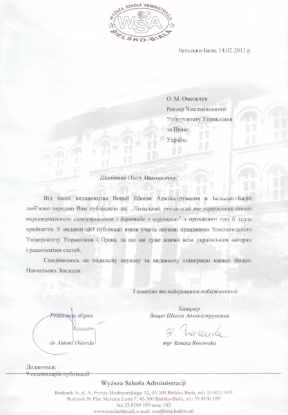 У листі-відповіді ректор університету О.М.Омельчук щиро подякував Ректору Вищої Школи Адміністрації в м. Бєльсько-Бялій пані Вєславі Коженьовській, Канцлеру ВША пані Ренаті Росовській, Декану Факультету Адміністрації ВША, редактору збірника пану Антонію Осерді, Асистенту Канцлера – пані Марії Жильцовій, а також всім іншим співробітникам ВША, причетним до видання збірника, за співпрацю і висловив надію на її подальший розвиток.