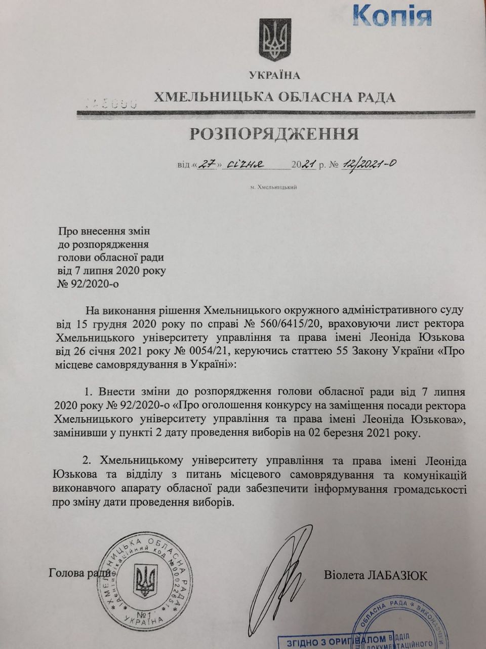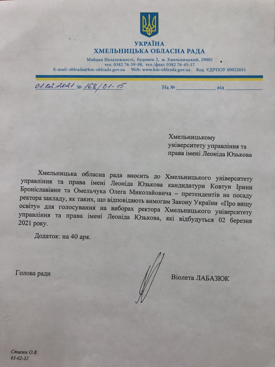 Лист від Хмельницької обласної ради щодо внесення кандидатур претендентів на посаду ректора Хмельницького університету управління та права імені Леоніда Юзькова