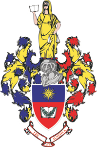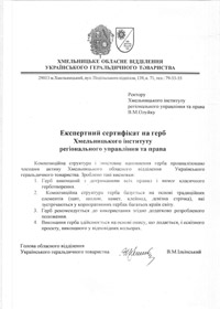 В щиті, на червоному тлі, біла (срібна) книга на відкритих сторінках якої розміщені дві зелені гілки (дубова і лаврова).