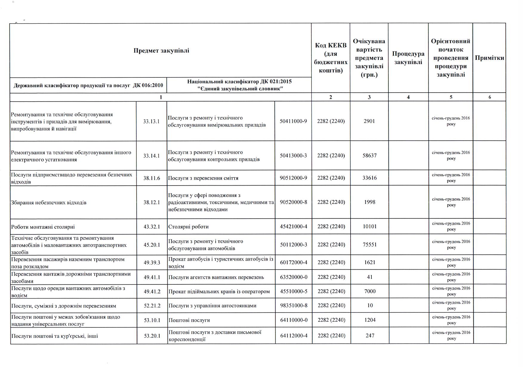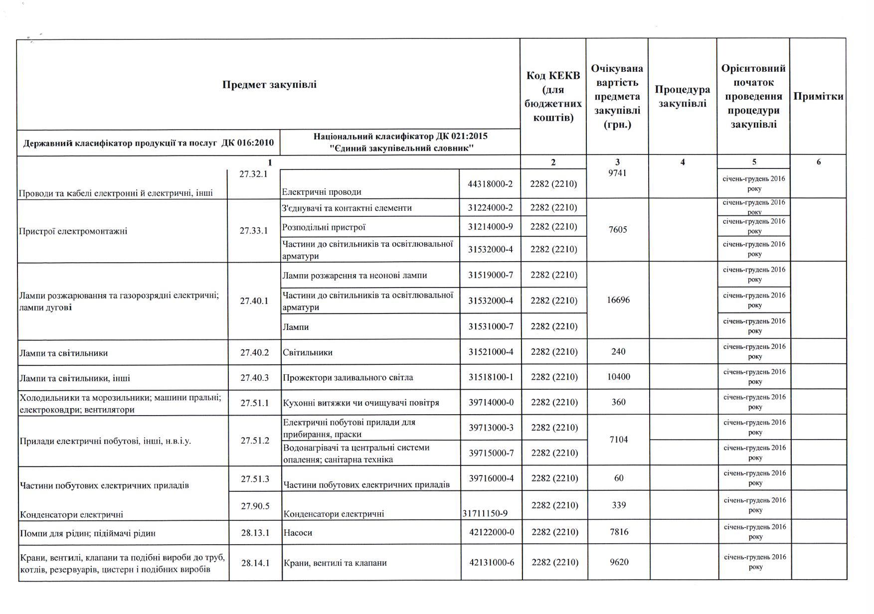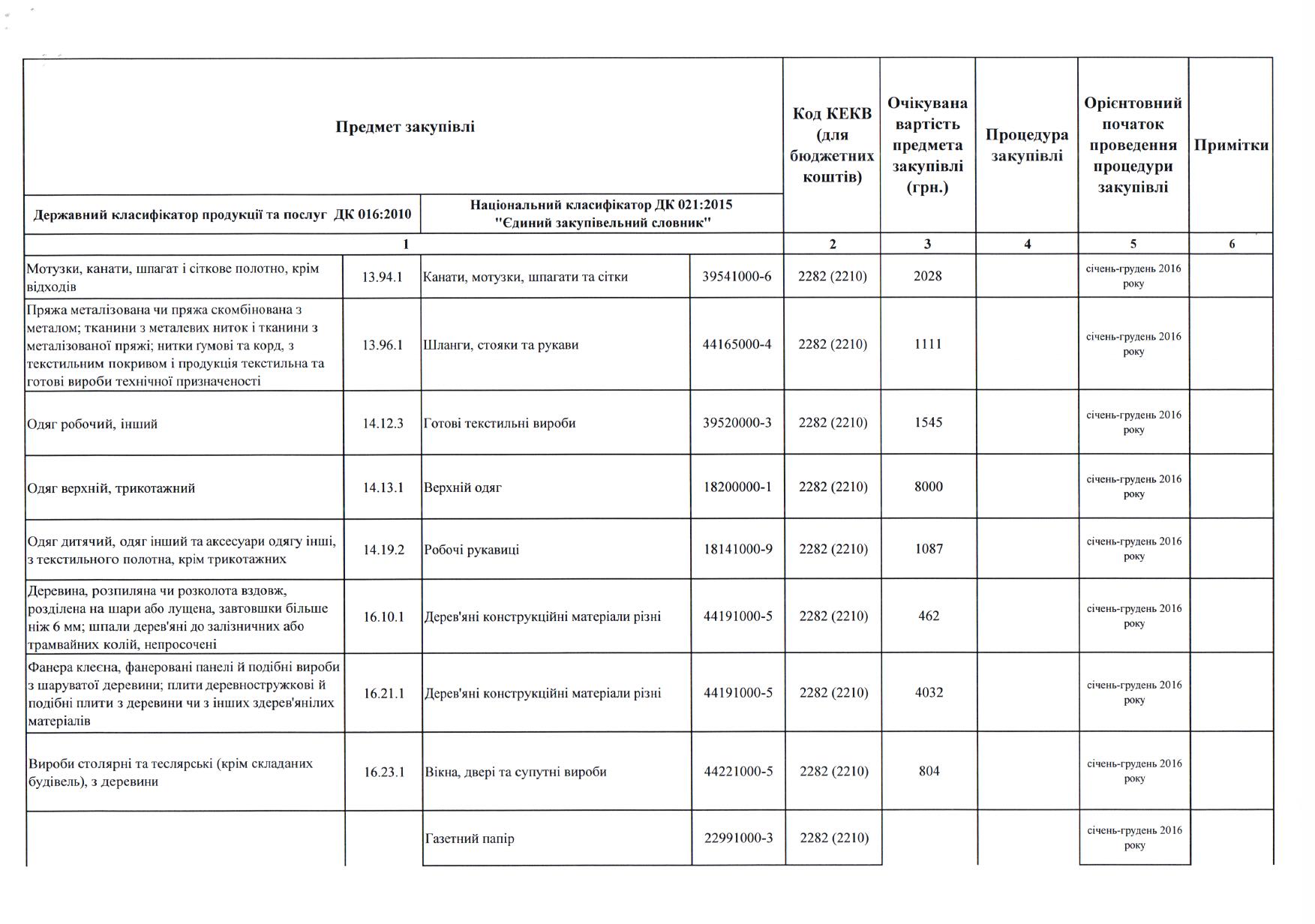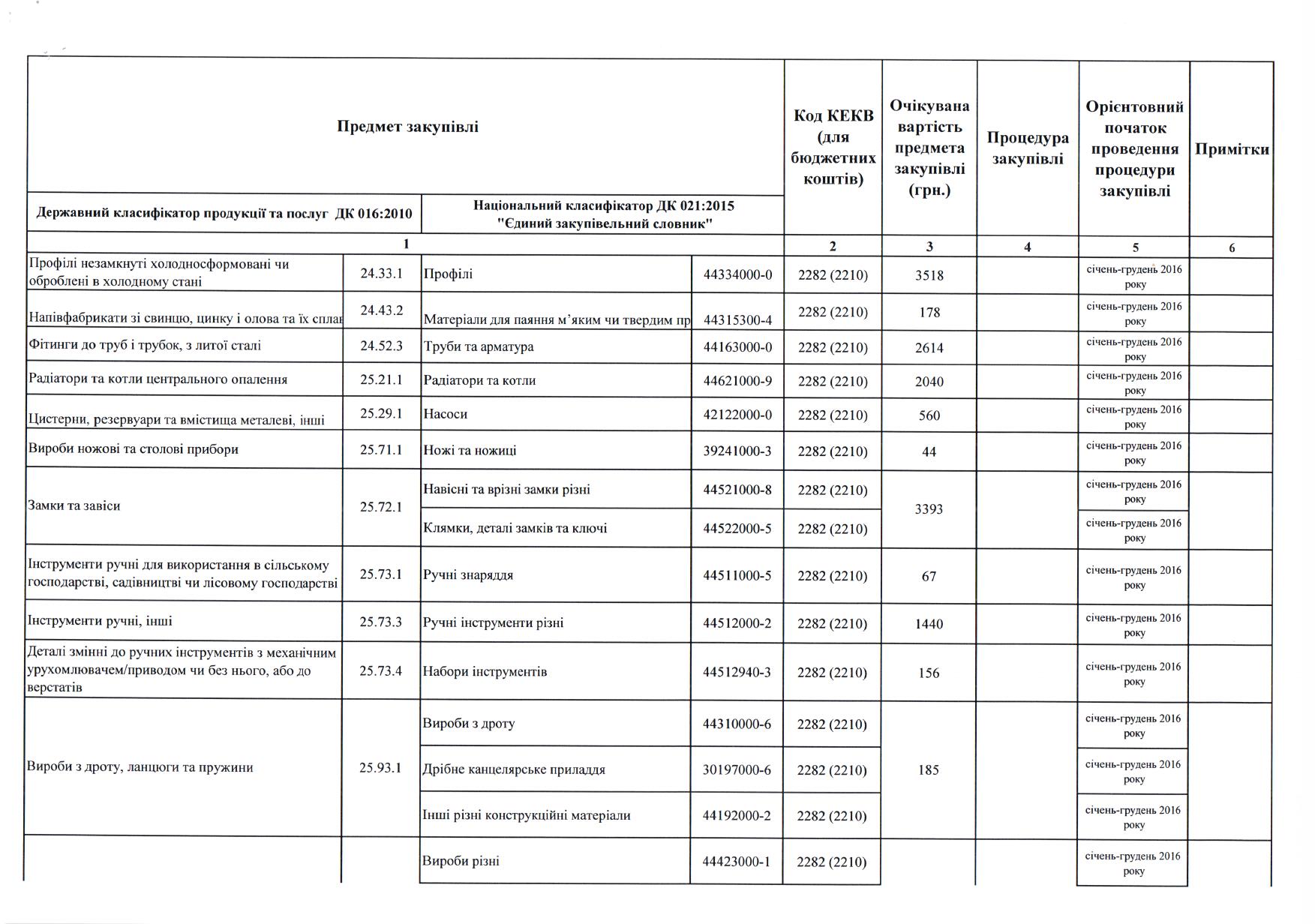 Додаток до річного плану закупівель на 2016р. із змінами.